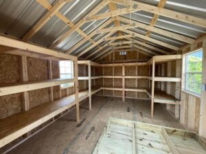 If you plan on using your shed as a man cave, she shed or work area we can add shelving, peg board and even a workbench for all of those tools. A recent customer even requested custom, extra long shelving as seen below. Ask one of our Hometown Sheds professionals and we’ll find a way to make it happen.